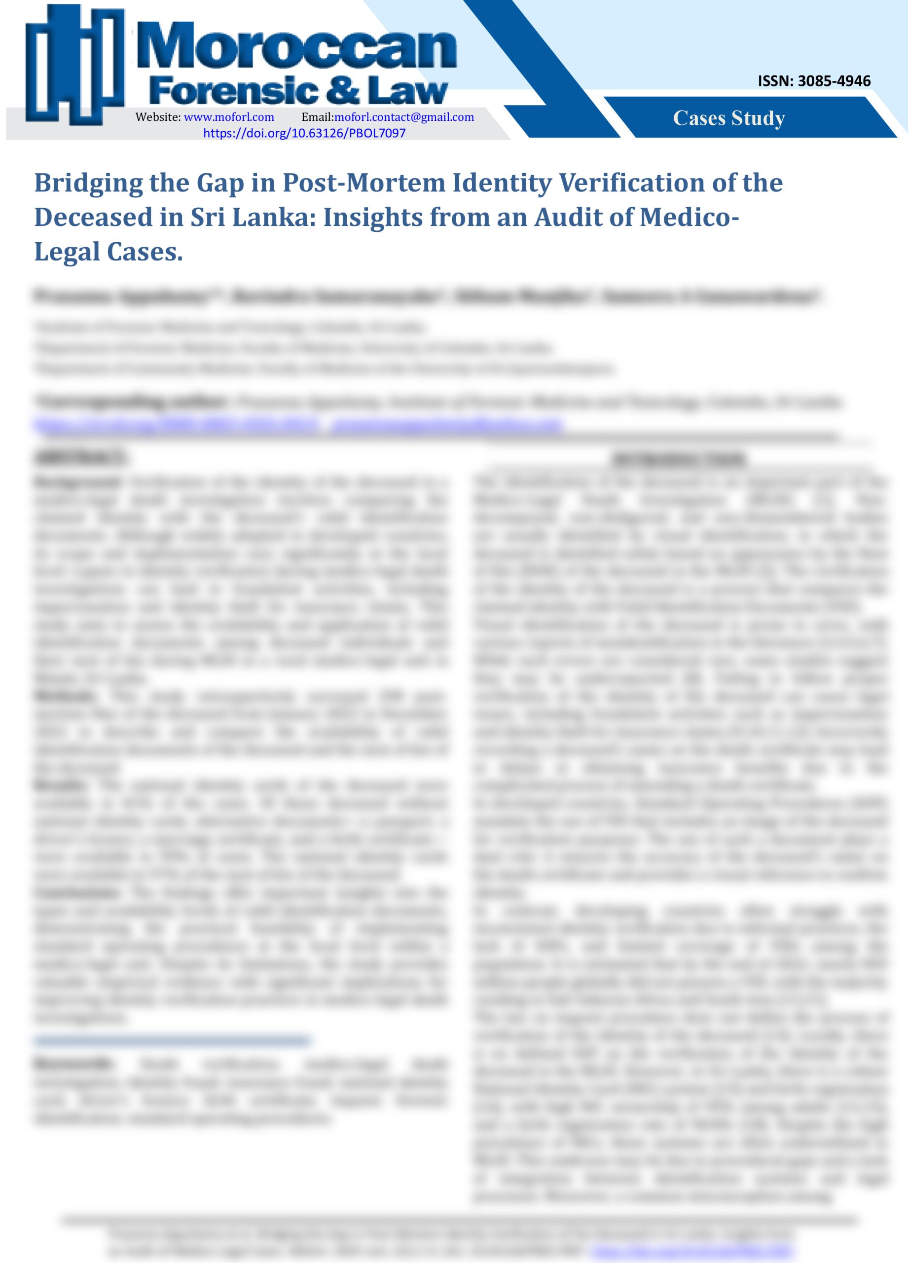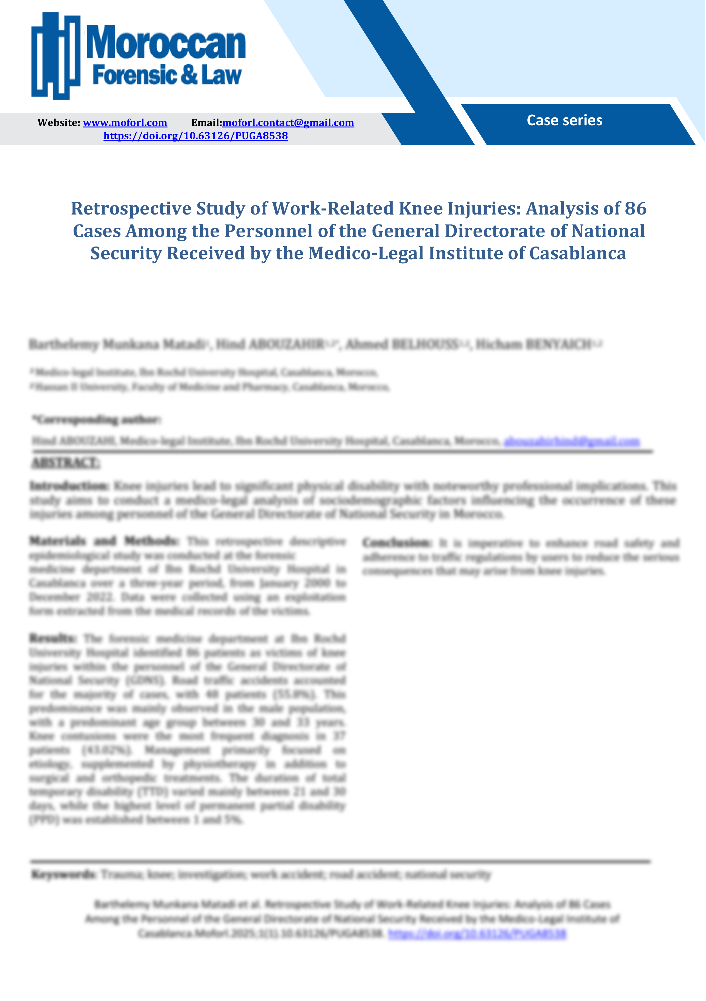 Moroccan Forensic & Law publishes scientific papers in various specialties aimed at a national and international scientific community. It regularly publishes the results of research submitted by national and international authors, as well as articles solicited directly from experts from various backgrounds and countries.